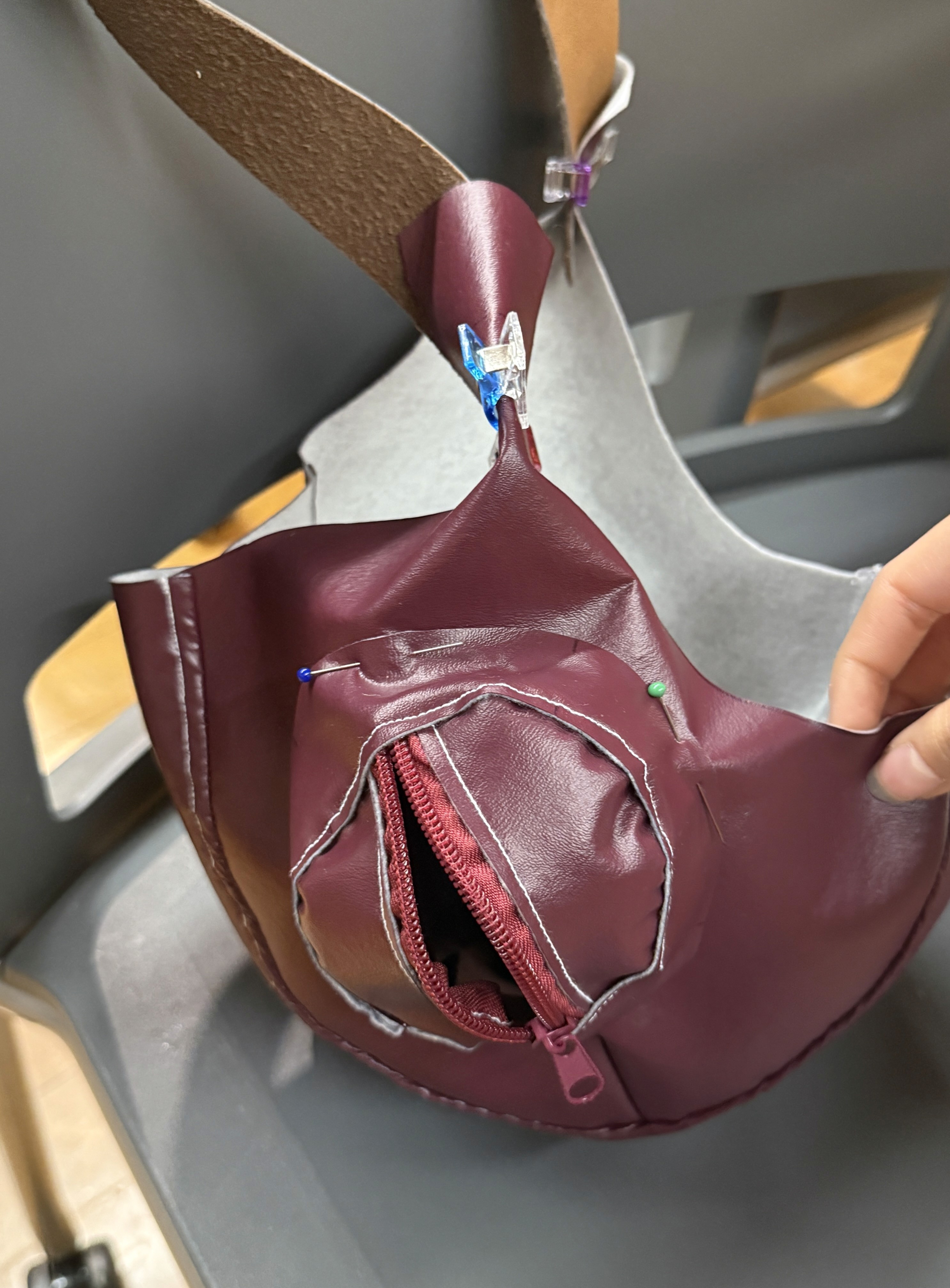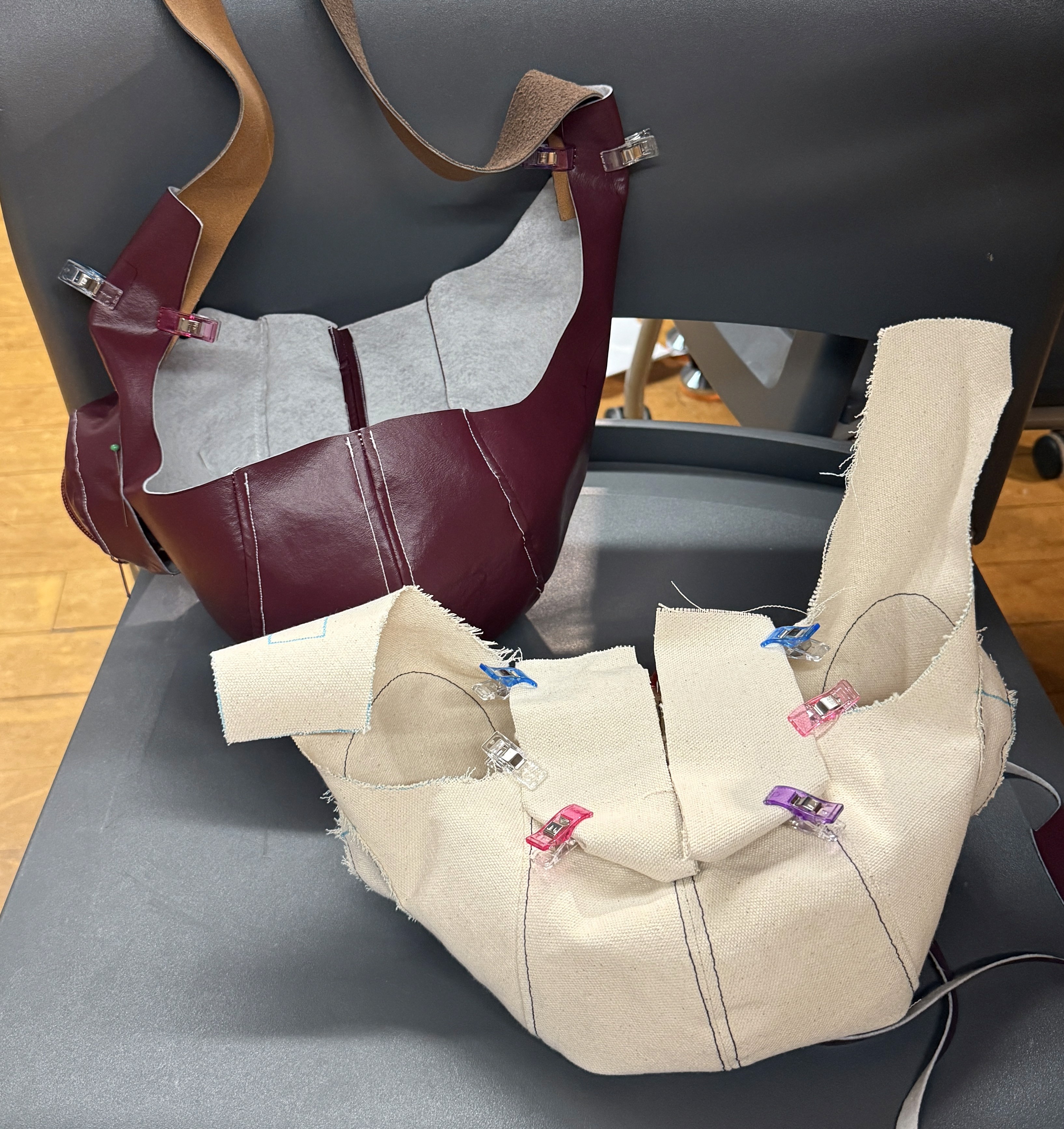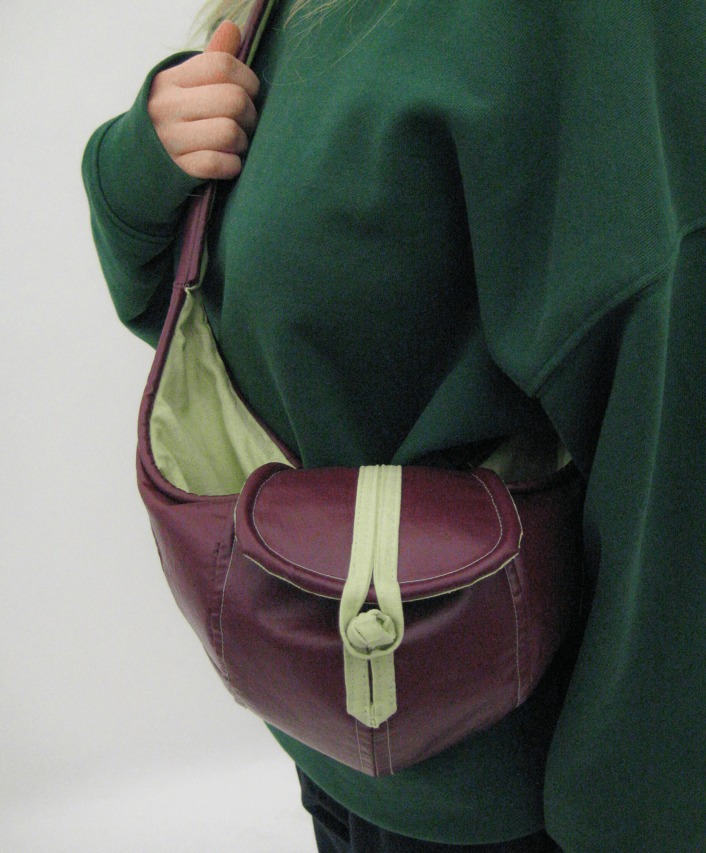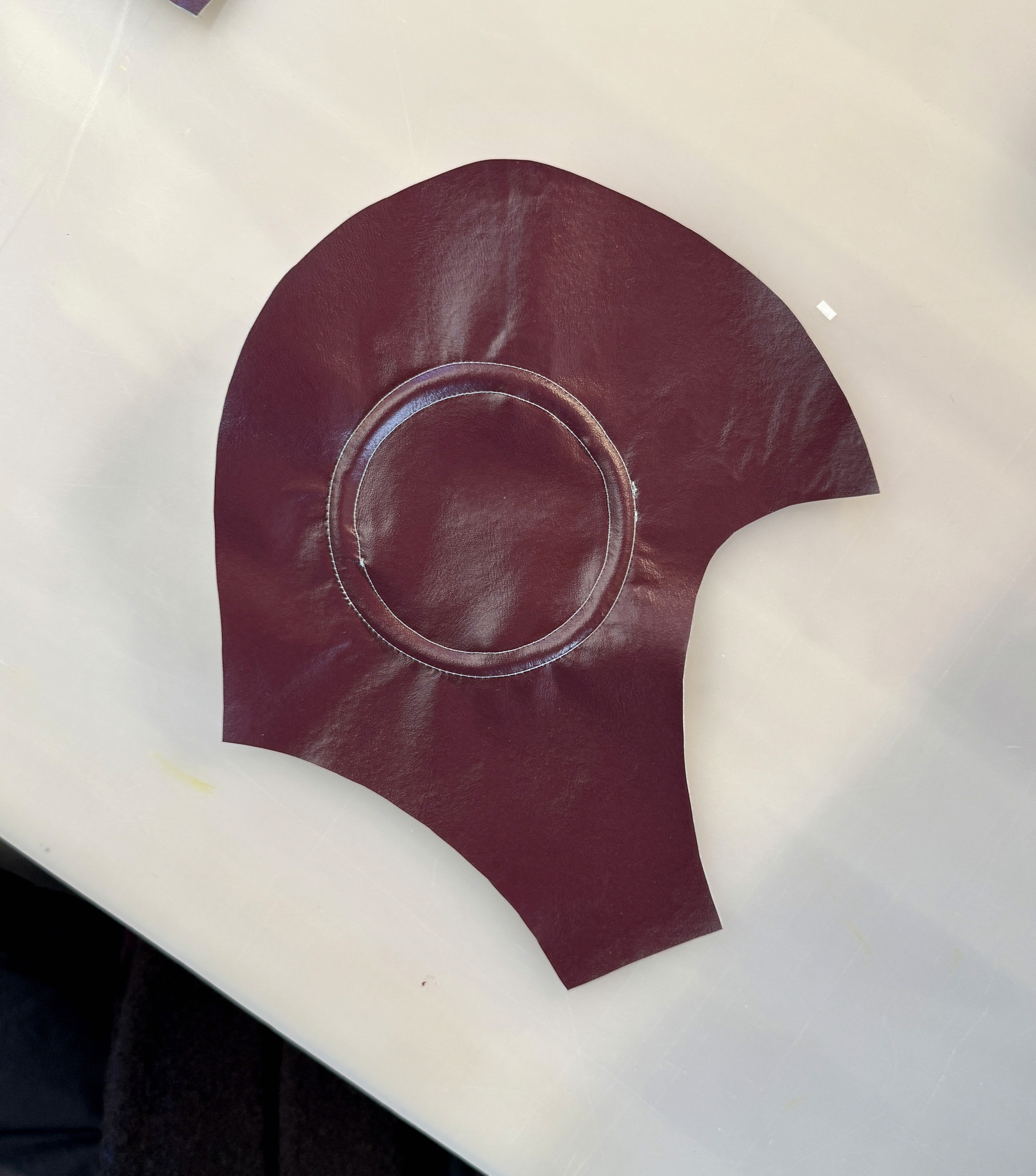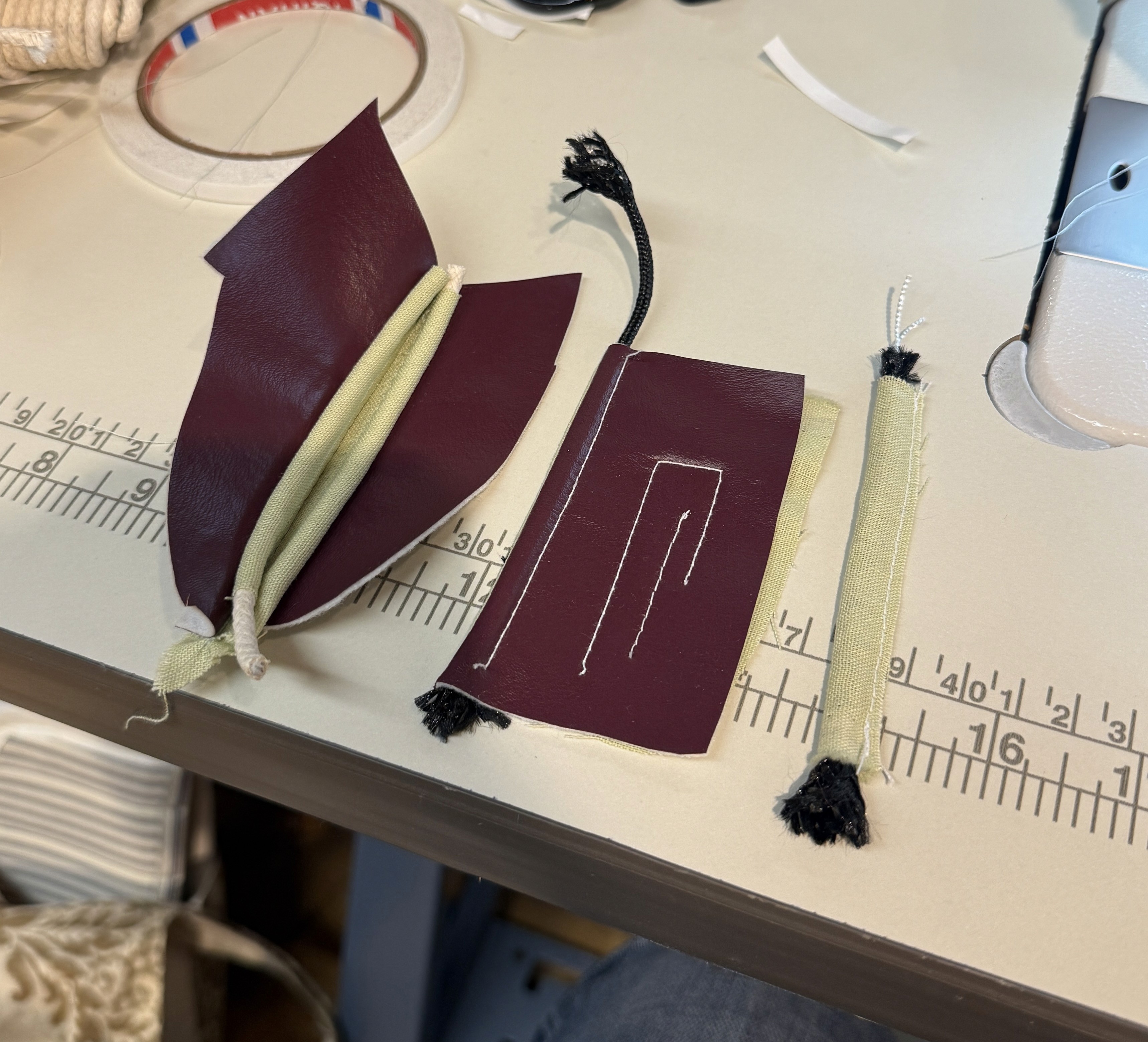 maroon vinyl, mint linen, thread, cord